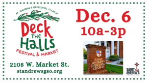 What is Deck the Halls? A Greensboro tradition for over a century, Deck the Halls is St. Andrew’s annual fundraiser for Mission & Outreach, which supports the work of local nonprofit human service agencies. The event, which this year is on December 6, provides a place to do holiday shopping and have some fun while supporting important work in our community. From wreaths and table arrangements to stained glass creations to handmade treasures of all kinds, you can find something for everyone on your list! Snacks, lunch, and holiday activities are also available. Please mark your calendar for Saturday, December 6, 10 a.m. to 3 p.m., and join us!