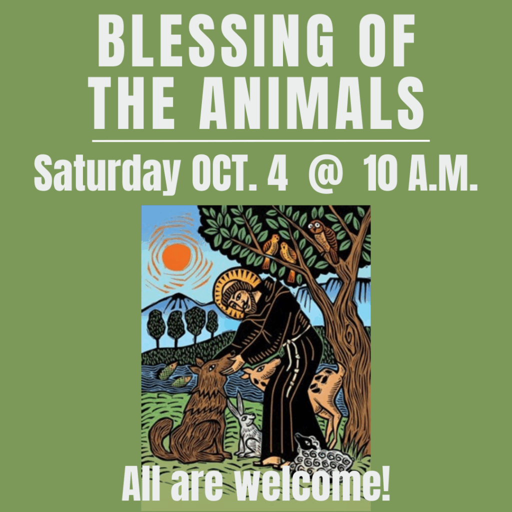 On October 4, the Feast Day of St. Francis, you are invited to bring your well-behaved pets for our annual Blessing of the Animals. Come gather on the front lawn at 10 a.m. to share God’s love with the creatures who love us through life’s ups and downs. Attire for pets: leash or carrier. The event is on Saturday so all can participate in our Mission Fair and the CROP Hunger Walk on Sunday, October 5.