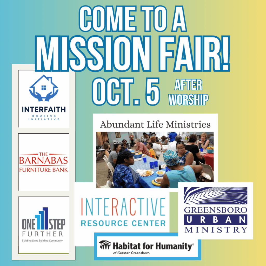 The Mission & Outreach Committee is pleased to sponsor a festive Mission Fair on October 5, right after worship. This will be a wonderful opportunity to join in community and conversation with our partner agencies working hard to address the increasing needs to feed the hungry and shelter the houseless. Join us in the Parish Hall, where we will host representatives from Greensboro Urban Ministry (G.U.M.), The Barnabas Network, the Interactive Resource Center (IRC), One Step Further Food Pantry, Habitat for Humanity, Abundant Life Ministries, and the Interfaith Affordable Housing Initiative (IHI). Come enjoy refreshments and the chance to chat directly with the people in the know about how you might use your time, treasure, and talents to make a difference for our neighbors by following Jesus’ command to feed the hungry and welcome the stranger.