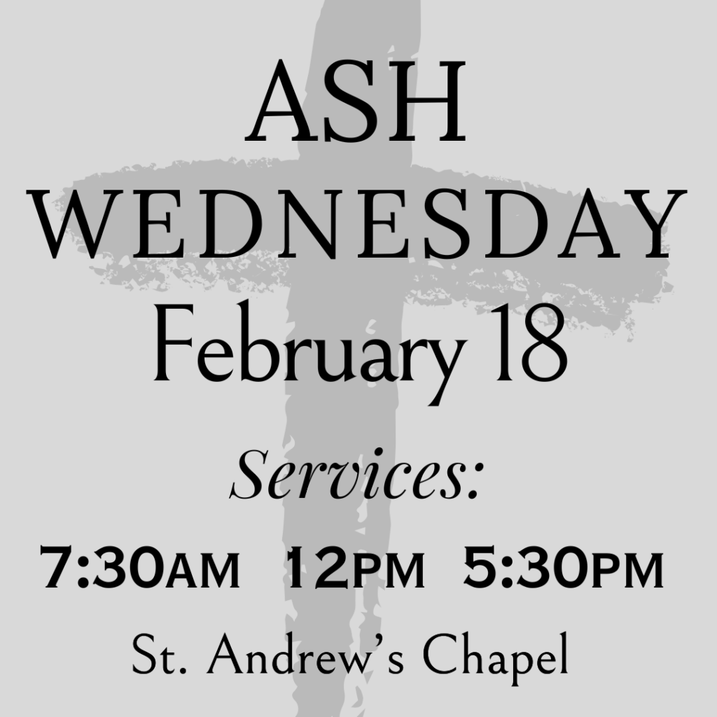 We will offer Ash Wednesday services with imposition of ashes at 7:30 a.m,. 12 p.m., and 5:30 p.m. in the Chapel. You are also invited to join the 52nd Annual Convocation-wide observance of Ash Wednesday at 7 p.m. at Episcopal Church of the Redeemer, 901 E. Friendly Ave.
