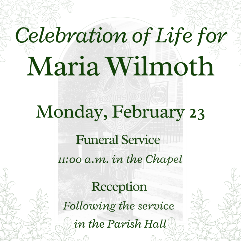 All are invited to the funeral for Maria Wilmoth, Monday, February 23, at 11 a.m., in the Chapel. A reception will follow in the Parish Hall.