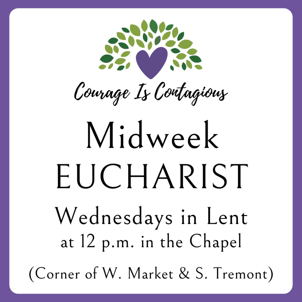 You are invited to a holy and life-giving Lent. Join us Wednesdays in Lent for a midweek Noonday Eucharist. We will meet in the Chapel (corner of W. Market and S. Tremont) at noon. All are welcome.