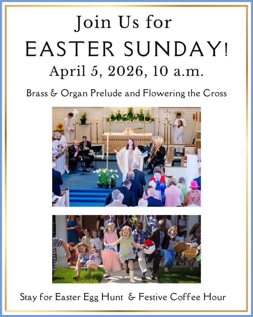 On Easter Sunday we will welcome all to celebrate the risen Christ with joy. A brass and organ prelude will be offered in the 10 minutes before worship. You are invited to bring flowers to add to the cross outside and bells to ring. Nursery care will be provided. Our school-age children will stay in church for this special day of worship. We will have bags for them to decorate, butterflies for them to color, bells to ring each time we hear the word “Alleluia,” and other fun ways for children to participate in the service. Join us afterward for an Easter Egg Hunt and a Festive Coffee Hour.
