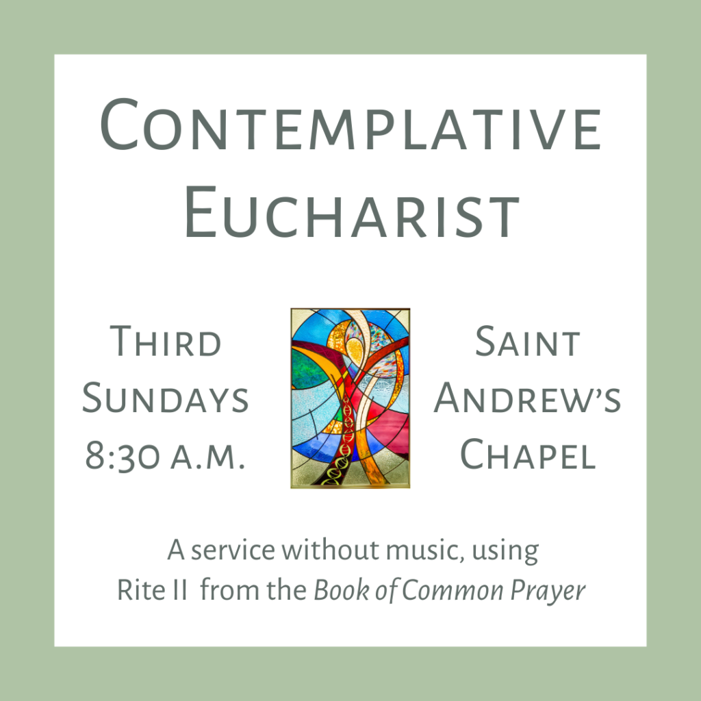 We offer a Contemplative Eucharist on third Sundays at 8:30 a.m. The service is held in the Chapel and is spoken (no music), using Rite II from the Book of Common Prayer.