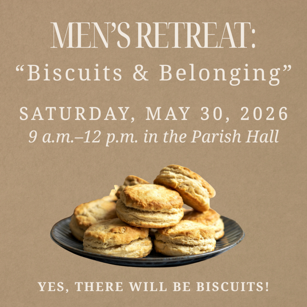The Men’s Retreat will be a morning of fellowship, connection, and reflection, led by Rev. Eric Tuttle, and exploring the ideas of community and friendship. We will meet in the Parish Hall on May—and yes, there will be biscuits! RSVP by May 25 to help us plan.