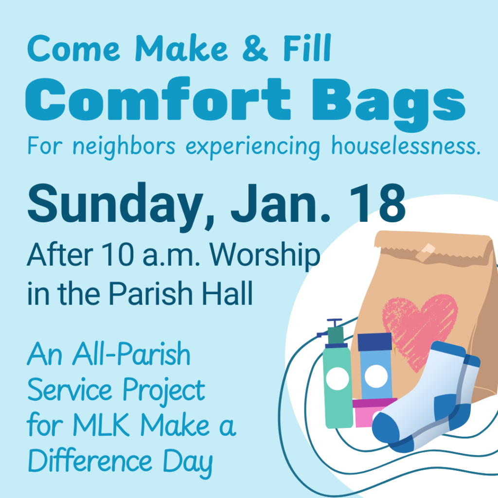 Make a Difference Day is an extension of the celebration of Martin Luther King, Jr.’s birthday. It is a time for giving back to your community. Join us in the Parish Hall after our worship on January 18 for an all-parish Make a Difference Day service project, as we fill and decorate “Comfort Bags” to be distributed later to members of Greensboro’s houseless community.