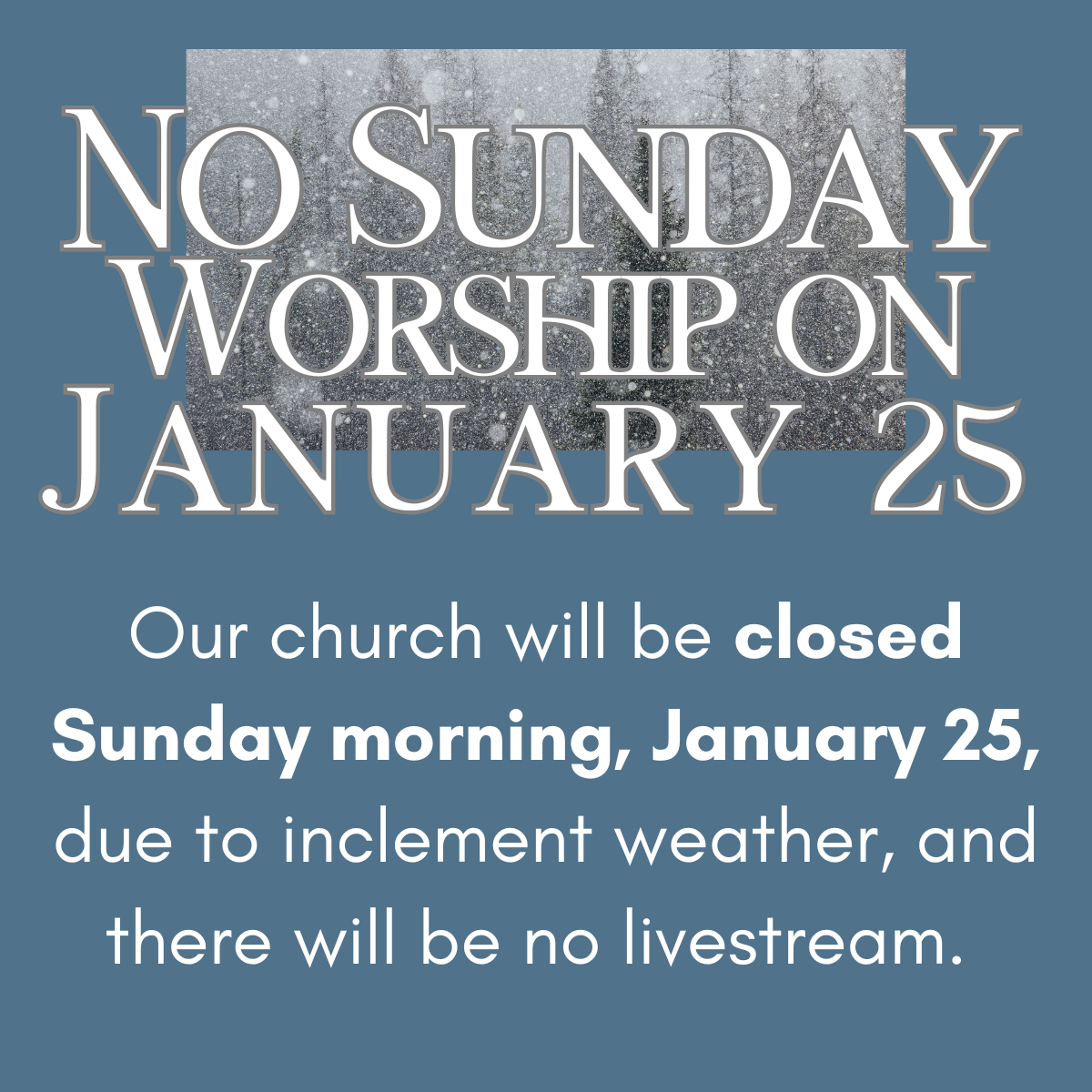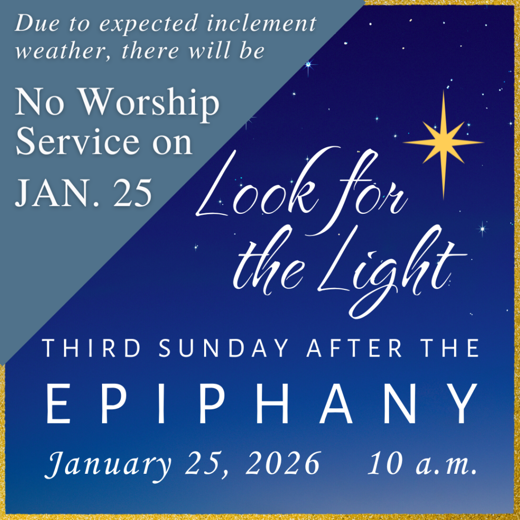 Travel is expected to be unsafe on Sunday, January 25, and we have decided to cancel worship and activities. If you have power where you are this Sunday, we warmly invite you to sit with this week’s bulletin or tune in to a prior Sunday’s worship service on our YouTube channel. (See adjacent “Watch Our Service” and “Worship Bulletin” links.)